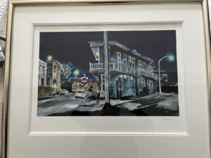 H Street, Washington, DC (2017) by Bob Dylan captures a quietly atmospheric American streetscape rendered in the artist’s recognisable, expressive style. The image, drawn from his celebrated Beaten Path series, reflects Dylan’s fascination with ordinary urban and rural settings encountered during his travels across the United States.