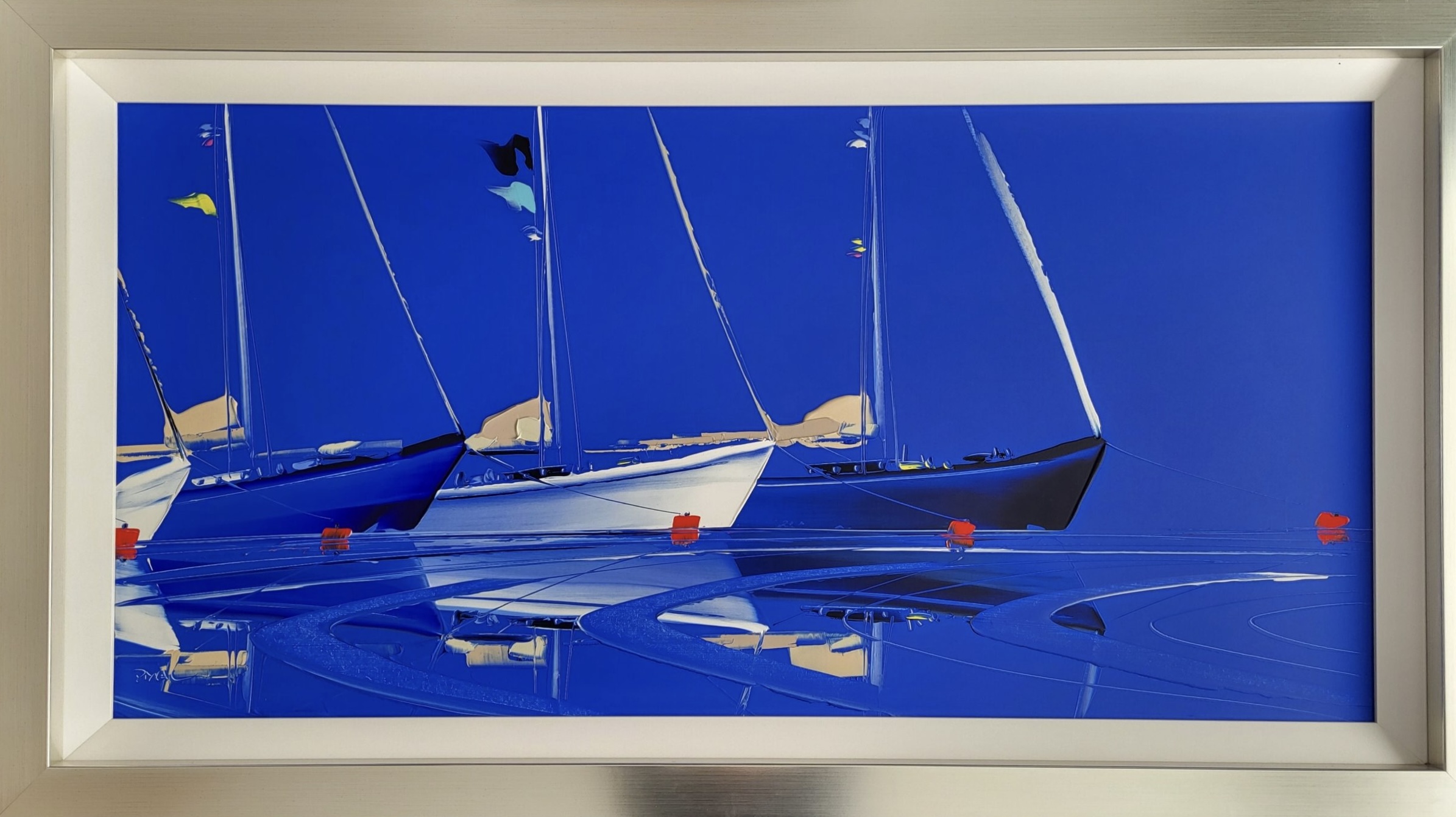 The smooth textures of the water and the sleek lines of the vessels guide the eye across the scene with gentle rhythm, evoking the soft sounds of water and breeze. Every detail is thoughtfully composed, blending abstract and realistic elements to create a timeless work that resonates across styles and settings. Quiet Mooring offers a moment of stillness and escape, making it a standout piece for any space—equally suited to modern interiors or more traditional collections.