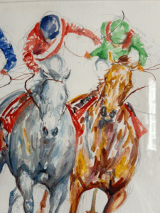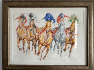 The artist’s deep connection with horses, rooted in her early years working in Newmarket’s racing world, infuses each composition with authenticity and emotion.
