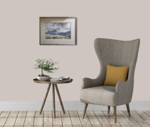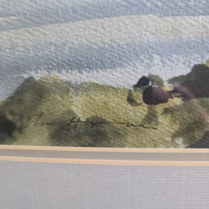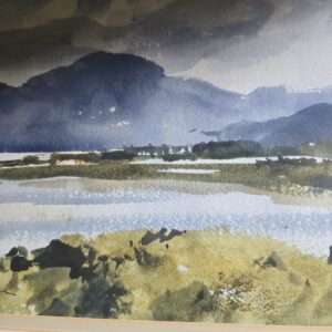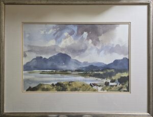 John Hoar’s In Connemara is a striking watercolour that captures the untamed beauty of the Irish landscape. With fluid brushstrokes and subtle tones of green and blue, Hoar evokes the sweeping hills, brooding skies and shifting light for which Connemara is known. His delicate handling of atmosphere conveys both the solidity of the land and the fleeting nature of mist and weather. The composition draws the viewer in, inviting the eye to wander across water, shadow and light. More than a depiction of place, In Connemara is an evocative journey that reflects the wild charm and timeless spirit of Ireland.