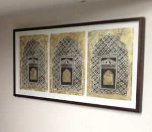 Her work combines fine line drawing, etching and screen-printing, often enriched with 22-carat gold leaf to evoke the warmth and spiritual resonance of Indian design.