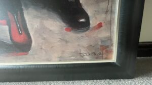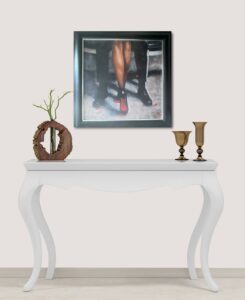 Pascale Taurua’s Entre Nous captures a tender moment of human connection, depicting two figures seated together with lifelike realism. Warm tones and rich contrasts dominate the palette, with the striking red of the woman’s shoe serving as a focal point that draws the eye and adds vibrancy to the scene. Subtle light and shadow enhance depth, giving the composition a tangible, intimate presence.