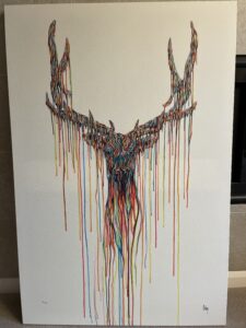 A striking portrait of a stag, Soldier of Love exemplifies Robert Oxley’s distinctive fusion of realism and psychedelia. The piece radiates strength and majesty through Oxley’s signature use of vivid colour and fluid brushwork, transforming the noble stag into an expressive, almost spiritual figure.